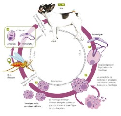 La hembra del mosquito pica a un animal infectado e ingiere su sangre y en ella hay macrófagos (células de defensa del animal) que contienen amastigotes, una de las formas del parásito. Dentro del mosquito, los amastigotes continúan su ciclo y se multiplican, de forma que al picar a un nuevo animal, le transmiten el parásito.