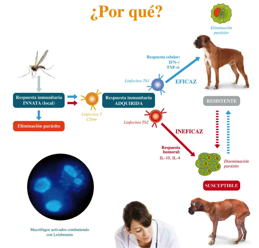 En un porcentaje menor de perros, la respuesta inmunitaria que se desarrolla no es celular, sino que es predominantemente humoral, produciéndose inmunoglobulinas, que por muy numerosas que sean, no son capaces de combatir adecuadamente al parásito; por lo que aparecen las lesiones y signos clínicos.
